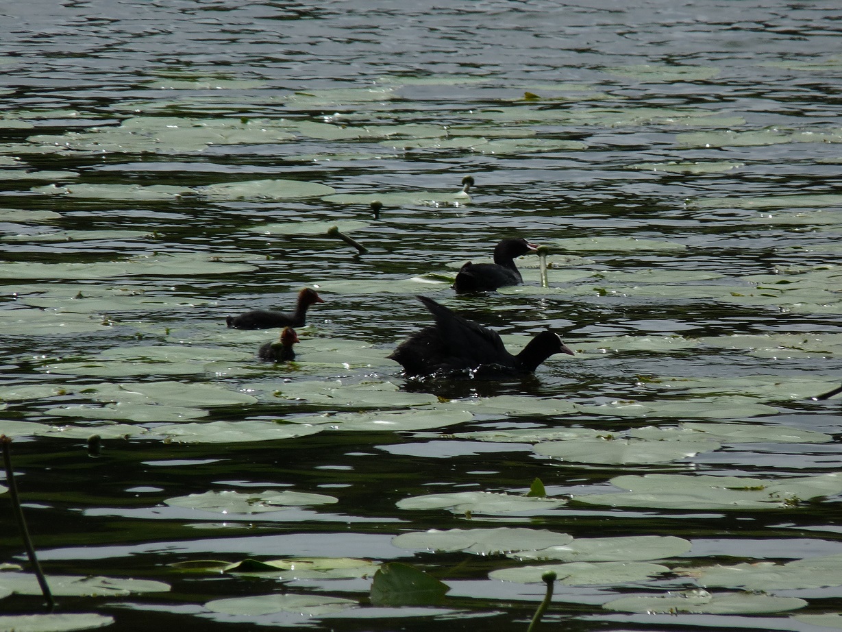 Un caillebotis permet de cheminer près des zones marécageuses. les poules d'eau et les foulques évitent les quelques pêcheurs et conduisent leur progéniture au milieu des nénuphars.