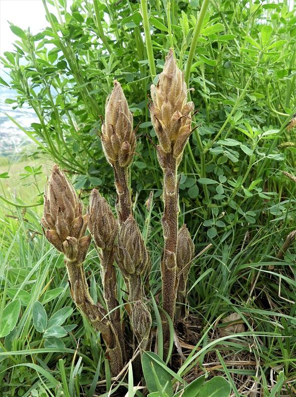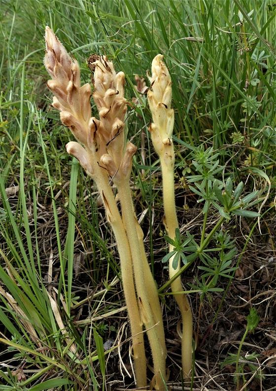 Ces plantes sans chlorophylle parasitent d'autres végétaux. Chaque espèce d'orobanche est inféodée à un genre ou espèce de plante. En observant celles qui les entourent on peut deviner à quelle orobanche on a affaire, élément intéressant ici car elles ne sont pas encore assez fleuries pour que nous puissions finaliser leur identification. Mais il est probable que ce soient :