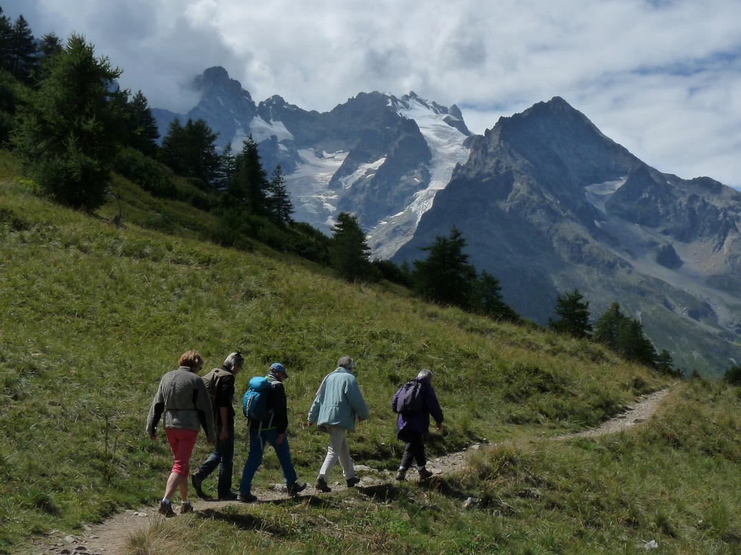 Après le pique-nique près des voitures, les huit botanistes ont emprunté une partie du fameux "Sentier des crevasses". Ce chemin rejoint le refuge de Villar d'Arène, avec toujours une vue magnifique sur le massif de la Meige dans le sens aller et celui des Cerces et du Galibier, au retour .